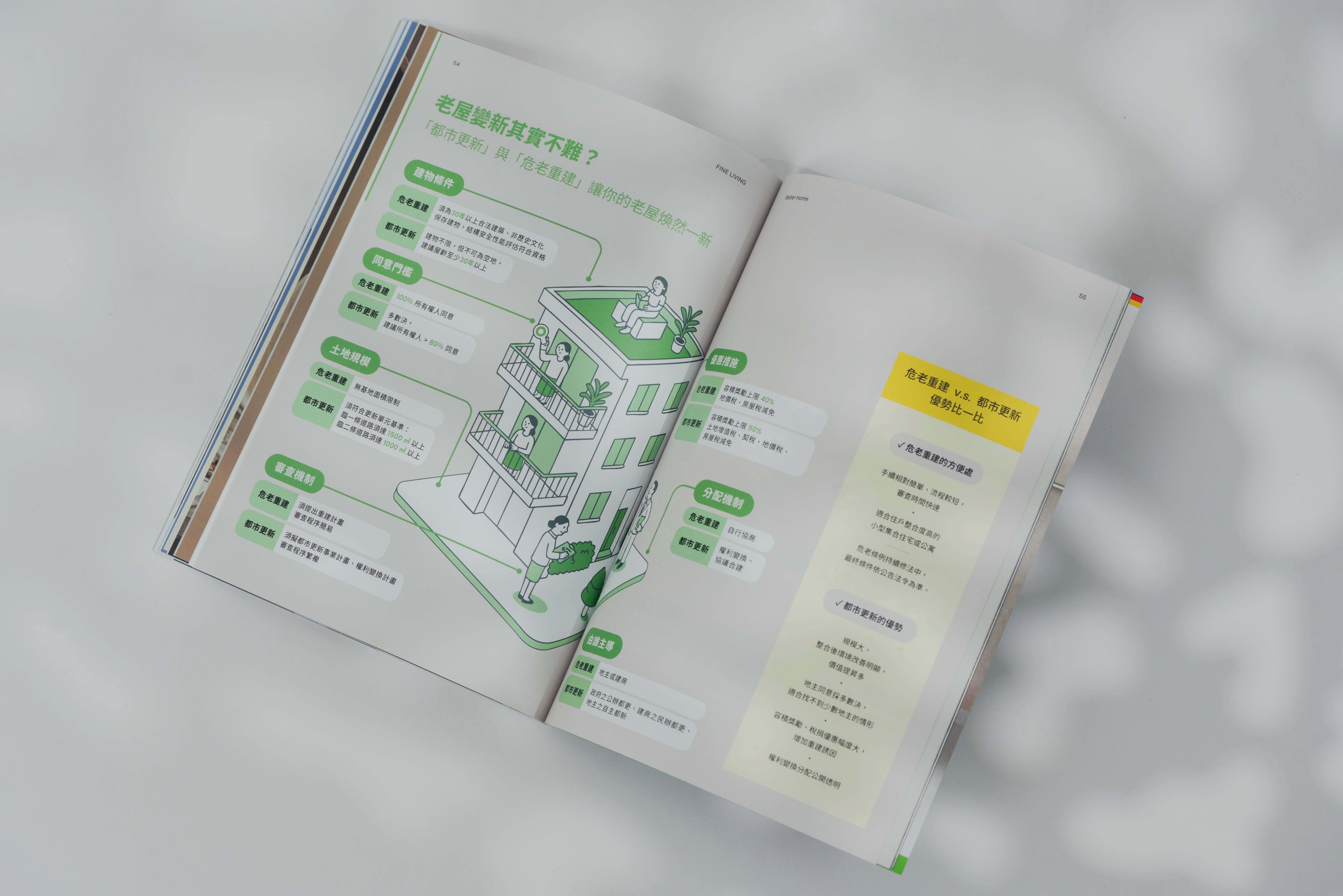 最後則以攝影圖集捕捉城市美好姿態,軟性呈現對於「Better City」居住的想像與期待;並加入簡潔易懂的插畫描述「危老重建」與「都市更新」,帶領讀者了解兩者的概念與區別,知曉熟悉的家怎麼以更安全、更舒適的樣貌延續下去,開啟「Better Home」的新篇章。